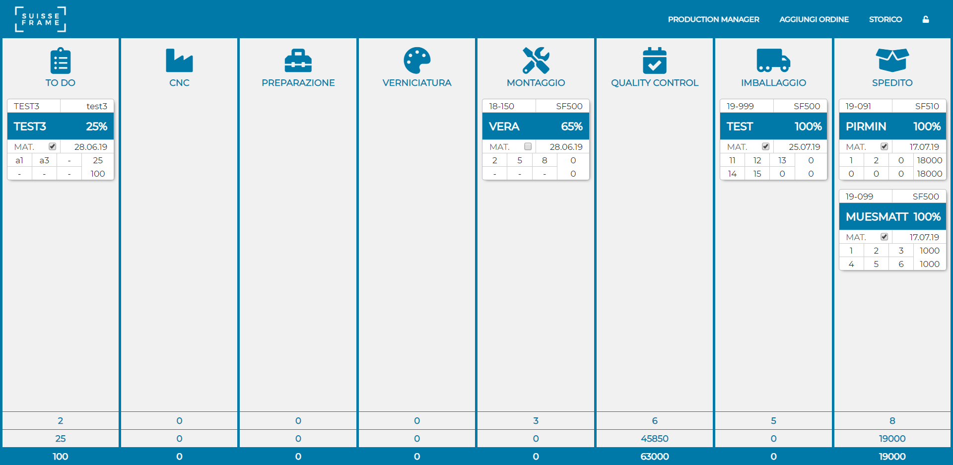 Suisse Frame is the first and only Swiss company to have specialized in the development, production and sale of wooden and wood-metal sliding windows. Following the instructions provided, we have created a web application that shows the status and value of production in real time. It is optimized for touch screens and allows employees to drag the project to change its state. The project was made in collaboration with the OBMD company.